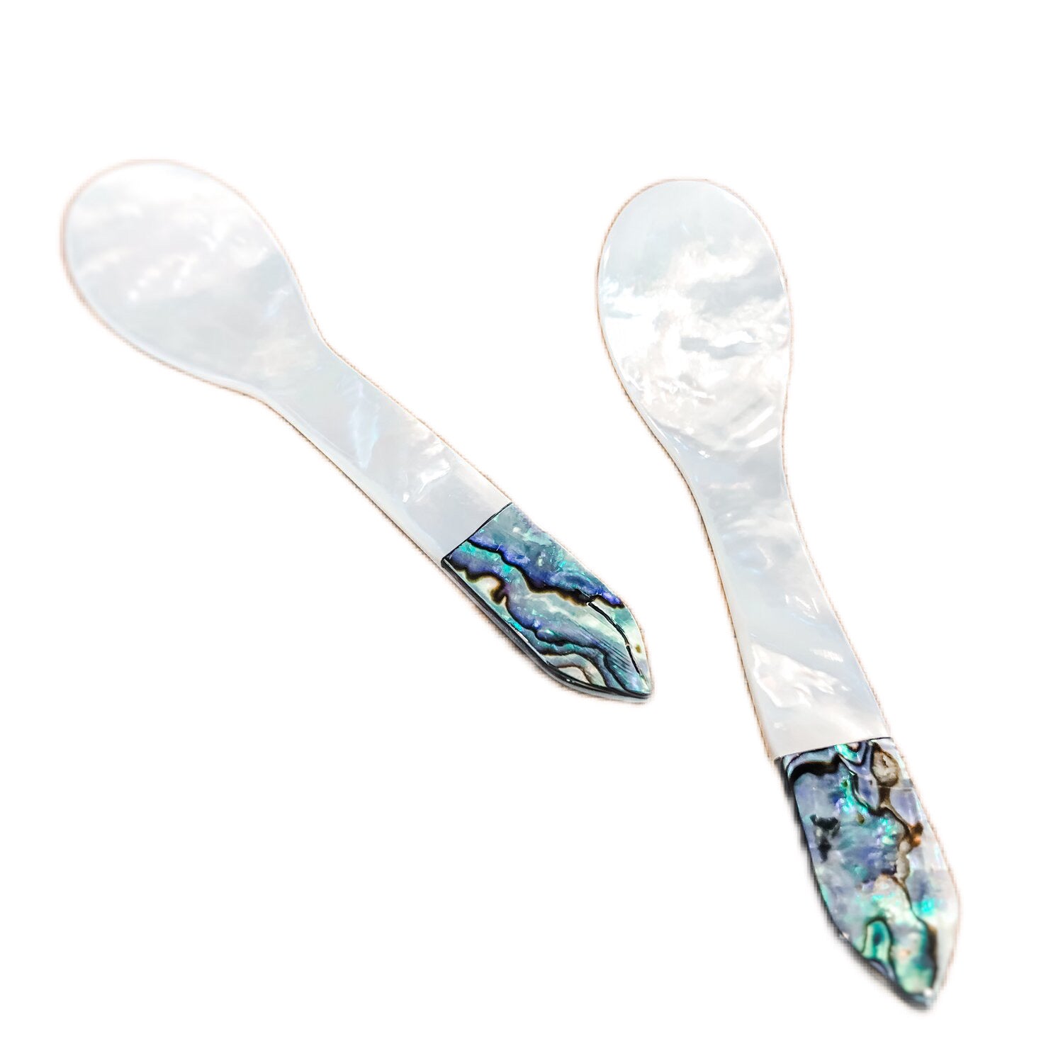 These caviar spoons are custom crafted from genuine saltwater mother-of-pearl and have local abalone shell inlays. While more delicate, saltwater pearl is superior to less expensive freshwater pearl for its bright luster.