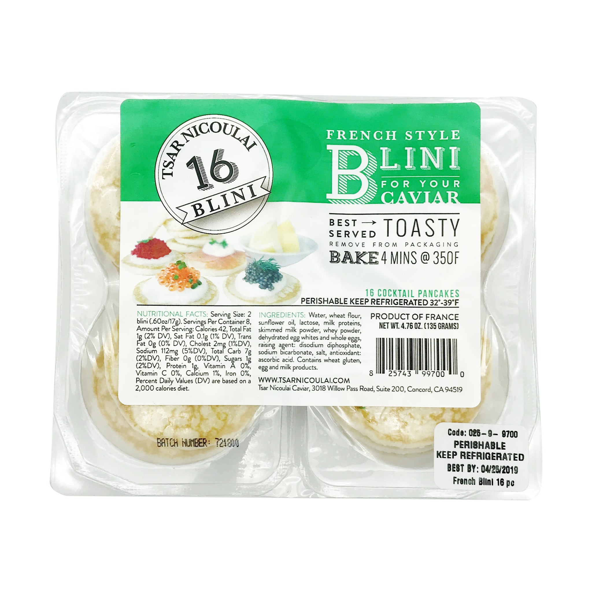 These 16 piece pre-made blini make an easy base for caviar and smoked fish. Best served toasty.